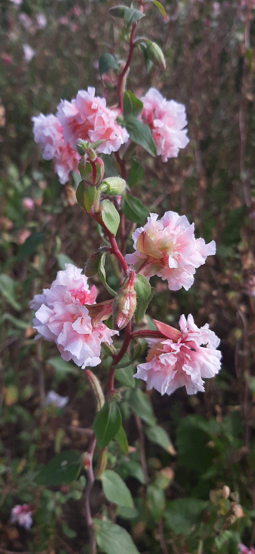 Vienmetė įspūdingos elegancijos gėlė. Violetiškai raudonus stiebus puošia gražūs dvigubi, pusiau dvigubi ir pavieniai šviesiai abrikosinės rožinės spalvos žiedai.
